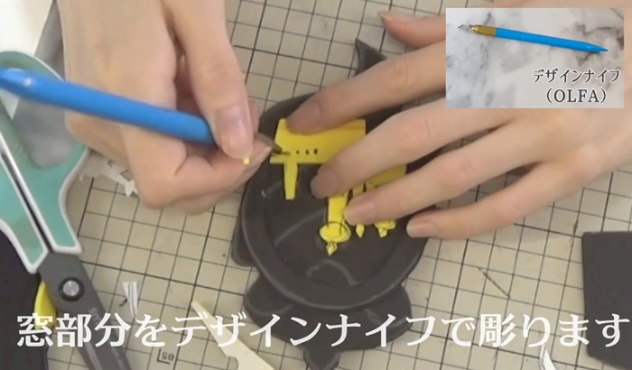 窓の部分をデザインナイフで掘り出し、凹凸をつけます