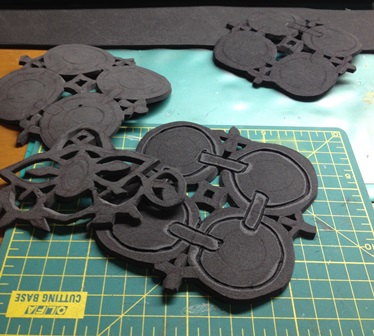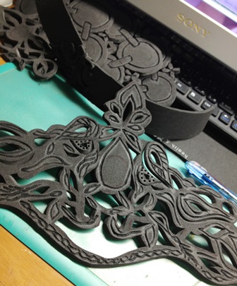 ウレタンを用意します。 デザインナイフ、はんだごてを用いて文様をくりぬき、彫ります。 腕と脚パーツ4点+頭パーツ |