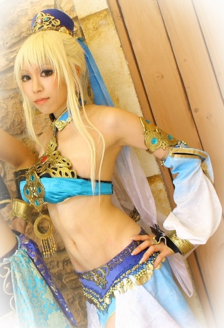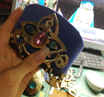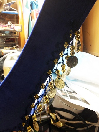 腰のしゃらしゃらはダンス用の物を分解、縫い付けました。 ここのパーツが個性的な場合は1枚1枚製作します。例:貂蝉 |