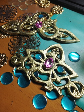 手前が追加のサンダルパーツ、奥の輪が正面リング この後下地ボンド→黒ラッカー→金ラッカー |