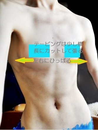尚、テーピングを貼る際は少し横長にカットして貼る事 胸を左右にひっぱる(寄せて上げるの逆です)をするとよりなじみやすいかと思います。 ![]() |