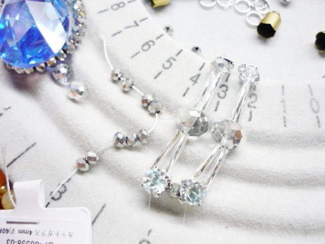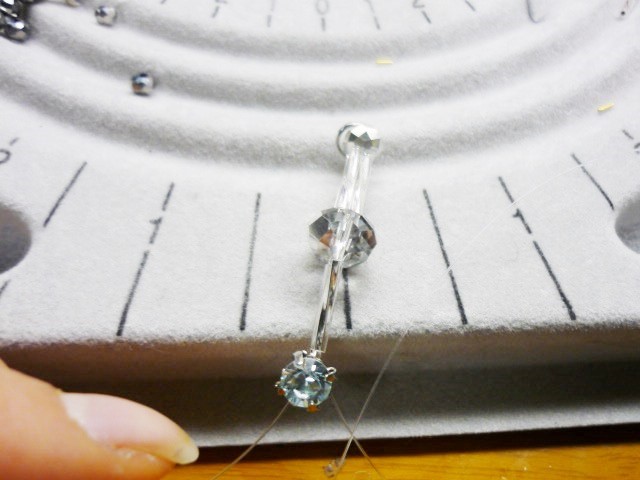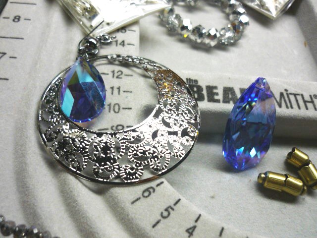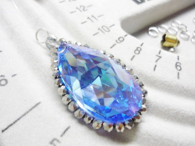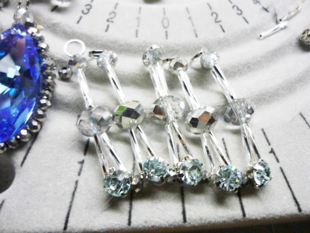 イヤリングのパーツとネックレスパーツは同じものを使用。 青のスワロフスキーをベースにします。 |