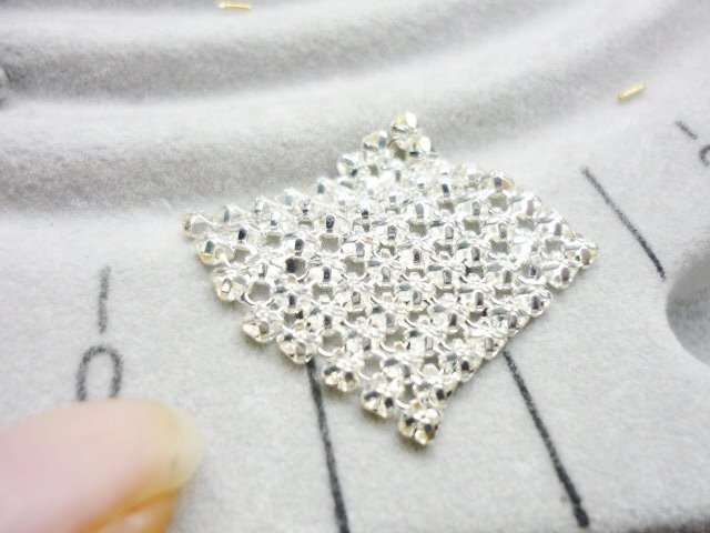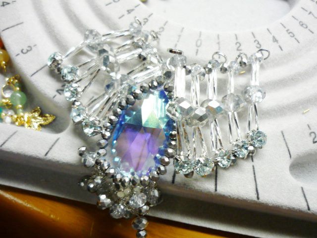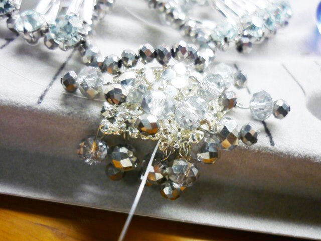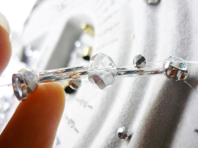 竹螺旋ビーズを間に入れ、クロムとシルバー×クリアガラスを中央に入れ、 網用のガラスパーツ(台付)を入れ、テグスを通します。 右下から上へ、上でターンして下へ。 ターン時は小リングに一度通して止めています。 |