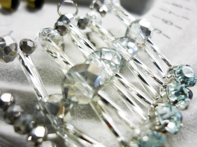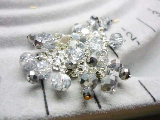クロムとシルバー×クリアガラスのビーズをTピンでつなぎ そのパーツを先ほどのパーツに編むようにCカンで取り付けていきます。 |