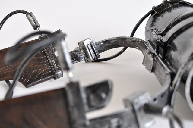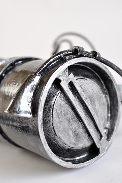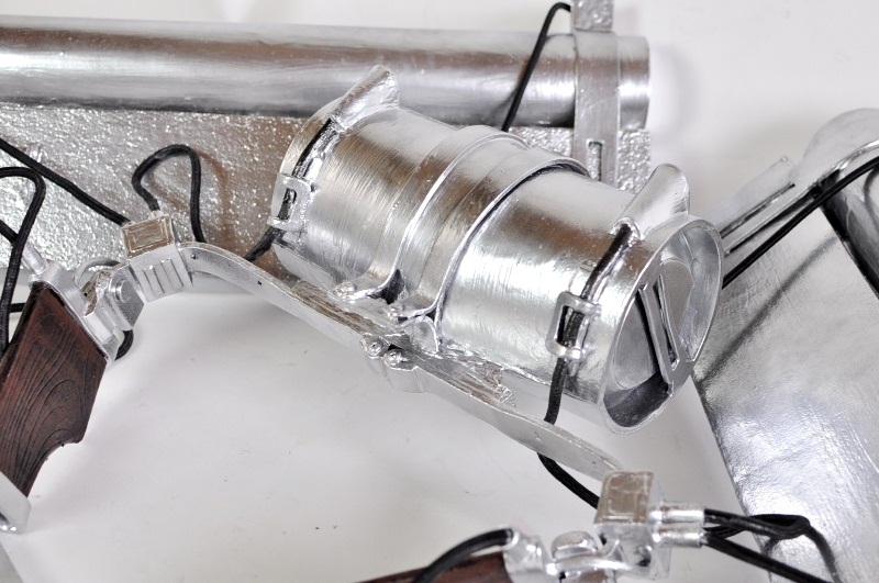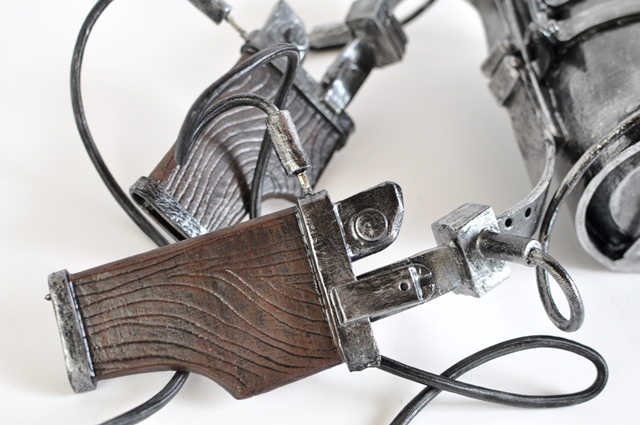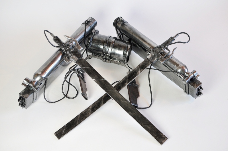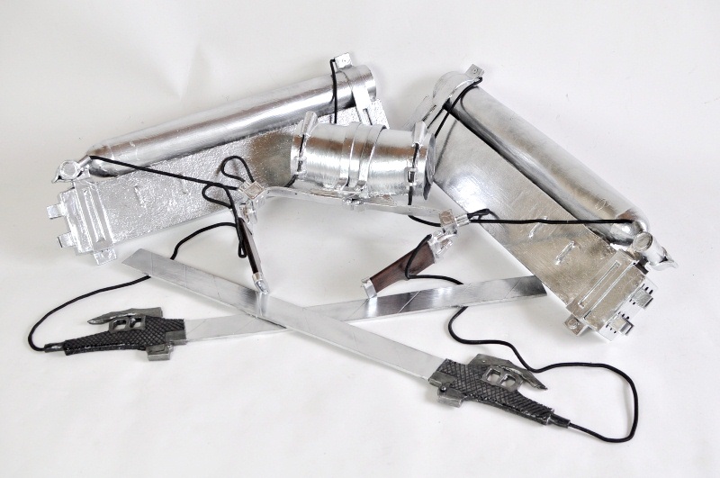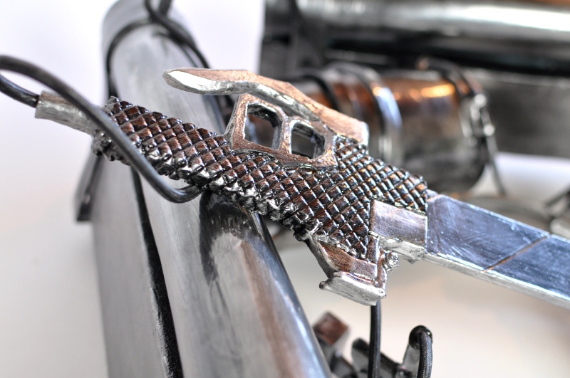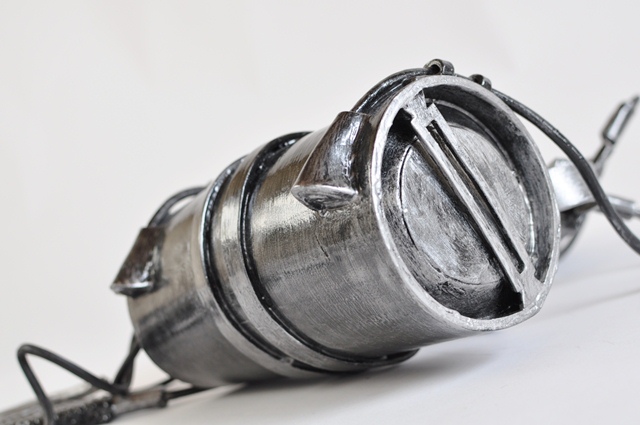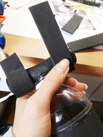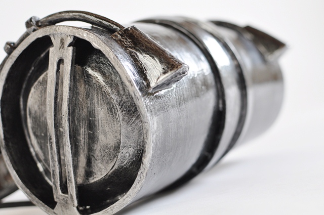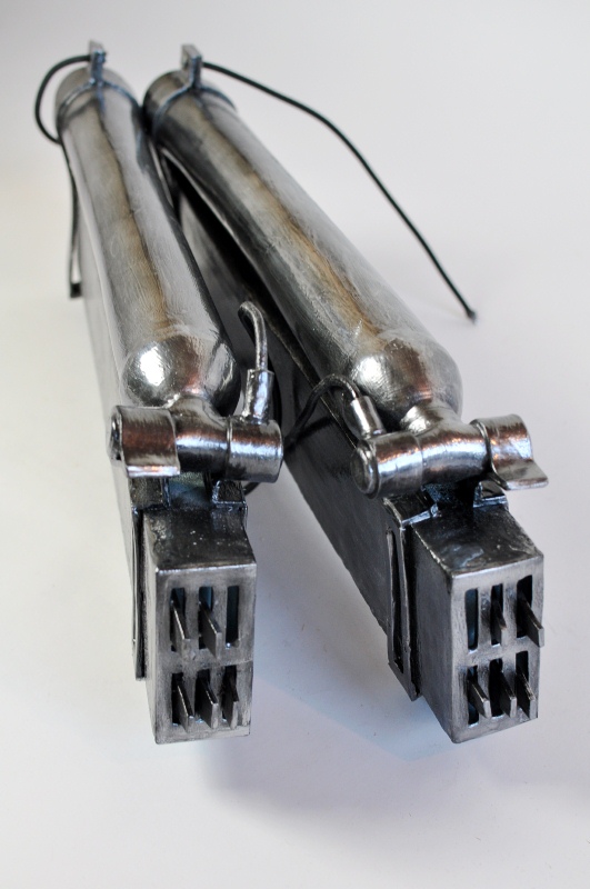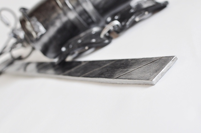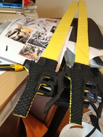ウレタンでスチレンボードを挟みます。 事前にスチレンボードにカッターナイフの刃のような線を掘り込んでおきます 余分な面はカット、火であぶり処理 持ち手の文様もひたすら彫ります。 |