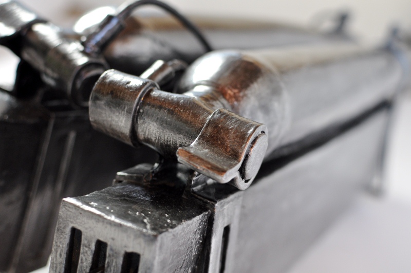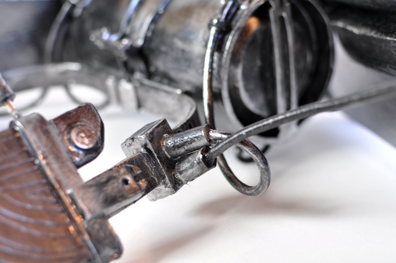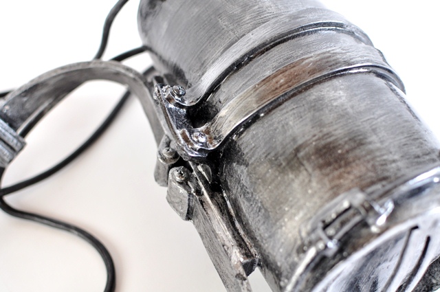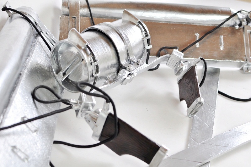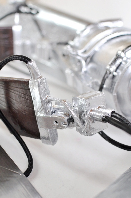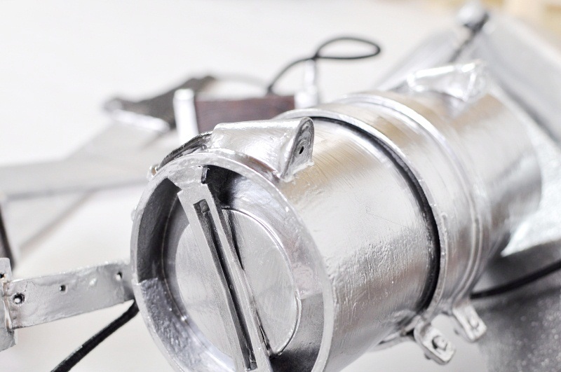 腰パーツ いきなり完成していますが、結構、時間がかかりました。 樽の形状部位は中央がふくれ、左右が細くなるようにウレタンを切り出します。 接着空気の排出口はワッシャーで縁取りをしています。 ひたすら資料とにらめっこをし、設計・組み立て |