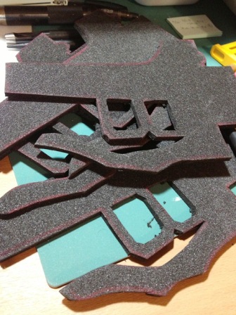 持ち手部分 ウレタンを切り出します。 はさむ形で使うため、二枚づつ、合計4枚 |
