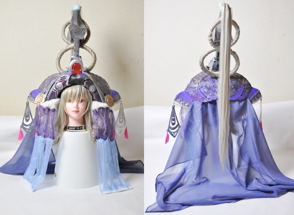 ウィッグを針金入りのスポンジに巻いて円を2つ作ったり、ポニーテールを提げたり。 |